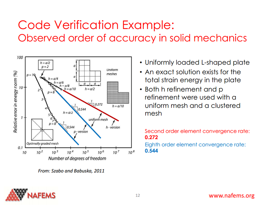 So does the end user have a role to play? My take is that the user needs to be aware and informed. If you are using a new method, element or procedure then test, test and test again. Use simple benchmark models that isolate the features you are interested in. These sorts of simple benchmark tests were one of the core outputs NAFEMS started to produce 35 years ago. Over the years we have updated the archive and recently our Simulation Governance and Management Working Group have been discussing our benchmark archive and asking if we should be producing more rigorous tests. Should we be updating these benchmarks to incorporate modern Code Verification methods such as the Method of Manufactured Solutions (see the upcoming events/resources tab for a great web event on this techniques by Dr Oberkampf and Dr Howell both members of the NAFEMS Simulation Governance and Management Working Group).