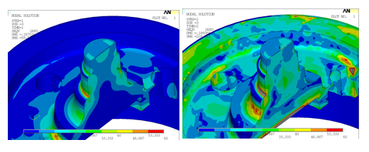 Figure 1: realistic performance of casting taking into account the effect of microstructure and defects on mechanical properties and the final residual stresses. (a) stress distribution with traditional approach, (b) stress distribution with design chain approach