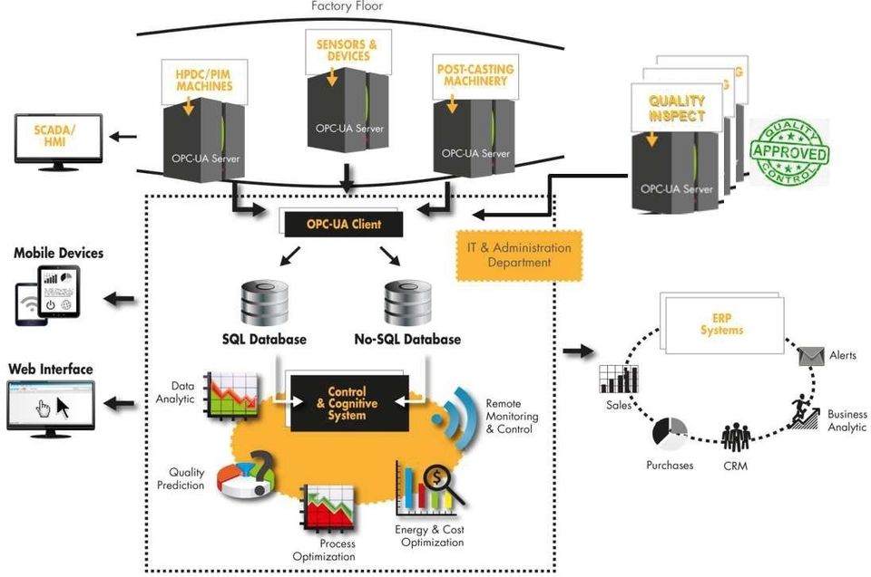 In the context of multi-stages production processes, metal and polymer manufacturing current trends show an improvement in demand for light products considering the material substitution for complex structural parts, the design and technology innovation as well as the evolution in smart production (e.g. smart foundry). Due to the high number of process variables involved and to the non- synchronisation of all process parameters in a unique and integrated process control unit, High Pressure Die Casting (HPDC), as well as plastic injection molding (PIM), is one of the most "defect-generating" and "energy- consumption" processes in EU industry, showing less flexibility to any changes in products and in process evolution [7-13]. In both, sustainability issue imposes that the production cells are able to efficiently and ecologically support the production with higher quality, faster delivery times, and shorter times between successive generations of products.