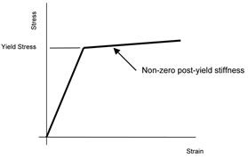 If loading causes regions in a structure to become plastic (i.e. exceed the yield stress) an analysis which includes a material with post-yield stiffness is required to evaluate the plastic stresses. A simple example is illustrated below. A linear analysis in which only the Young’s Modulus (E) is included will substantially overestimate such plastic stresses and a separate value of post-yield stiffness (often noted as H) is required. Setting a reliable value for H is often problematic but a value many orders less than E (and sometimes zero – see previous articles) is often used.