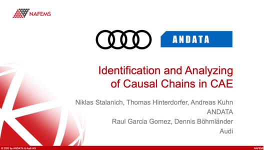 The presentation by Niklas Stalanich, Thomas Hinterdorfer, Andreas Kuhn from ANDATA, and Raul Garcia Gomez and Dennis Böhmländer from Aud focused on "Identification and Analyzing of Causal Chains in CAE." It highlighted the integration of Finite Element Analysis (FEA), Simulation Data Management Systems (SDMS), and Artificial Intelligence (AI) to automate in-depth analysis of FEA results and assure simulation quality standards in the automotive industry. The concept involves a new approach called "Wirkkettenanalyse" or the analysis of the chain of effects. This method helps understand the logical sequence of interacting components in complex structures, like vehicles. It aims to identify the relevant chains of effects for a given sensor signal, thereby answering questions about causality and influence of various components on each other. Application examples include causality studies, design target evaluations, estimation of uncertainties, sensitivity analysis, and performance comparison. The approach provides a way to automate various in-depth analyses by modeling causal relations for physical and mechanical problems. The analysis method involves detection of parts and segments, calculation of the effect structure, analysis of design evaluation and causalities, and sensitivity analysis. The approach uses advanced tools and software for automated detection, graph interpretation of effect structures, and criteria-based search problems. The innovation brings several advantages, such as enriching FEM post-processing analysis, automating in-depth analysis of FEM results, retrieving new analytics from old data in SDMS, enabling innovative forms of data mining, and laying the foundation for virtual product approval.