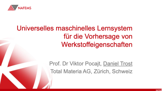 Prof. Dr. Viktor Pocajt and Daniel Trost from Total Materia AG in Zurich, Switzerland, presented on a universal machine learning system for predicting material properties. They discussed the critical need for accurate material property information in engineering simulations and the challenges in sourcing these data from standards, books, articles, and the internet. The presentation highlighted the problems faced due to the lack of knowledge about material properties and standards, leading to engineering errors, missed opportunities in design optimization, and difficulties in international communication between procurement and production. The typical data available for materials like aluminum, stainless steel, and carbon steel were discussed, emphasizing the variability in properties depending on factors such as heat treatment. To address these challenges, Total Materia AG has developed a curated database application like TM Horizon, featuring functionalities like smart comparison, export capabilities for various CAE formats, cross-references and equivalents, advanced search and comparison, compliance assessment, and a material console. However, they acknowledged that it's technically impossible to have all properties for all materials, heat treatments, product forms, working temperatures, and environmental conditions from experiments and standards. The solution proposed is a universal machine learning system for predicting material properties. This system works on a large dataset (over 500K materials and 30M+ data points) using the company's taxonomy and VDA-231 classifications to create separate models for different types of materials, conditions, and properties, resulting in over 1000 ML models. The system uses inputs like material designation, chemical composition, or family, and optional factors like product form and heat treatment. The outputs include mechanical properties at room temperature, temperature dependence of mechanical and physical properties, nonlinear properties, and environmental impacts. The machine learning models are benchmarked with large test sets for the highest result certainty, typically over 90%. Several use cases were presented, including filling data gaps for materials like aluminum and titanium, conceptual design applications, and exploring material variations. The impact of composition and heat treatment on properties like tensile strength and yield strength was also showcased. The integration of this system into the CAE process was emphasized, stressing the importance of saving, reusing, and sharing data to reduce the time spent searching for information, repeating tests, and underutilizing test data.
