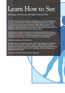 One often gets the feeling that the steadily growing sentiment in the world is“the more, the merrier”. Quantity beats quality and information speaks involumes. So is the trend in computing – bigger really IS the better. Pour enough data into the data lake then feed it into some black box machine learning algorithms, rigged with n-depth layer semantic networks, and out comes all kinds of conclusions that one could, and could not, possibly think of. This development is partly a consequence of, and partly a driver behind, the viral spread of sensors and the corresponding rise in connectivity. Any conceivable thing is hooked up in the Internet of Things (IoT) age. Whatever is observable is now considered worth observing. Is it an AI renaissance, or its breakthrough? We have data, big time, it is Big Data time. The early masters of scientific observation, such as Isaac Newton and Leonardo da Vinci, didn’t have this luxury. They had to be smart, careful and alert, observing exactly what was needed in the process of discovery. They had to concentrate on that which could be used to shed light over their suspicions, hunches and hypotheses while avoiding distractions. In the words of da Vinci: They had to learn how to see.