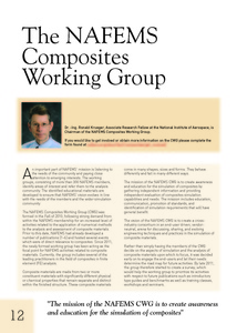 The NAFEMS Composites Working Group (CWG) was formed in the Fall of 2010, following strong demand from within the NAFEMS membership for an increased level of activities related to the application of numerical methods to the analysis and assessment of composite materials. Prior to this date, NAFEMS had already developed a number of publications and hosted several events which were of direct relevance to composites. Since 2011, the newly formed working group has been acting as the focal point for NAFEMS activities related to composite materials. Currently, the group includes several of the leading practitioners in the field of composites in finite element (FE) analysis.