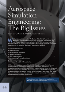 Wichita, Kansas, known as the “Air Capital of the World,” was the venue for “Aerospace Simulation Engineering: The Big Issues”, in November last year. The one-day event was co-hosted by NAFEMS Americas and NIAR (National Institute for Aviation Research) at the Wichita State University to facilitate discussions on the following “Big Issues” identified by NAFEMS: (a) Simulation Governance, (b) Democratization, (c) Certification by Simulation, (d) Systems Simulation, e) SDM Implementation, (f) Manufacturing Process Simulation, (g) HPC Deployment, and (h) Simulation & Additive Manufacturing. NIAR operates as a department of the Wichita State University which is home to more than a dozen laboratories as well as the FAA Center of Excellence for Composites and Advanced Materials (CECAM) and the National Center for Advanced Materials Performance (NCAMP). The event was held in the NIAR training facility, the National Center for Aviation Training (NCAT), and was a central part of a “Week of Learning” at the venue, which provided the analysis community with a range of NAFEMS training courses to choose from.