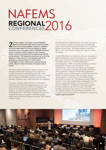 2016 saw another successful round of NAFEMSRegional Conferences take place around the globe.These events bring together industrial, academic and technology experts from all disciplines of digital simulation are a rare opportunity for NAFEMS members and non-members alike to attend a cross-industry, vendor-neutral event dedicated to engineering analysis and simulation. The Regional Conferences serve to bring together a wide spectrum of the leading visionaries, developers, and practitioners of CAE-related technologies, to share experiences, discuss relevant trends, discover common themes and explore future issues.