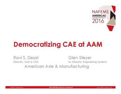 Presentation made by R. S. Desai, G. Steyer at the NAFEMS Americas Conference 'New Frontiers in Product Modeling and Simulation' that was held in Seattle, Washington on 7-9 June 2016.