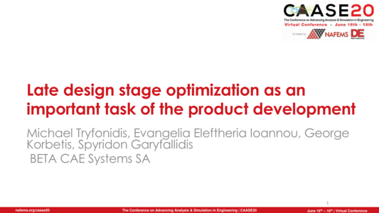 During product development, many analyses including optimization, take place at different stages of the product design. Although optimization at early stages is a very important task, as it provides solid directions for the final design, late stage optimization has significant presence in product development. Late stage optimization can act as models’ fine tuning and as a process that can fix deficiencies without the need to go back in a previous design stage. The aforementioned ability is even more valuable when manufacturing methods have been decided, acting as important constraints to the design change flexibility.