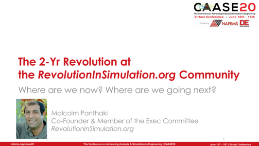 The RevolutionInSimulation online community resource (Rev-Sim.org) was founded in 2018 – it was launched at the last NAFEMS CAASE conference in June 2018. Rev-Sim provides professional resources and a collaborative community to help increase the value of engineering simulation software (CAE) investments through the Democratization of Simulation. Here you’ll have access to success stories, news, articles, whitepapers, blogs, presentations, videos, webinars, best practices and reference materials to help democratize simulation in your organization. Experts have volunteered to be Topic Moderators, curating the resources and authoring blogs on various important next-generation simulation topics such as Automation, Apps, Democratization, HPC, Business Challenges, Digital Twins, Digital Thread and SPDM, and others. You’ll also have one-stop access to simulation specialists, industry organizations, special interest discussion groups, and industry media, along with software and consulting service providers to accelerate the return on your simulation investments.