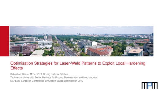 The papers presents and compares three strategies to derive optimal laser-weld patterns for a plate with hole in the first step. Aim of the strategies is to find weld pattern with at less hardened elements to meet part requirements like a maximum plastic strain, node displacement or a more homogenous internal energy density. Based on the fact that, the presented approach targets an optimisation bases on local effects, even the results of the academic load-case should