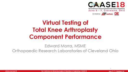Thus, virtual testing is finding an increasing role in defining TKA performance in clinical orthopedics. The virtual test methods described in this presentation are able to discern differences in performance between TKA designs, are faster and less expensive than physical methods, solve the contemporary problem of obtaining predicate designs for comparison and have been accepted by the US Food and Drug Administration as evidence of safety and effectiveness for pre-clinical product testing.