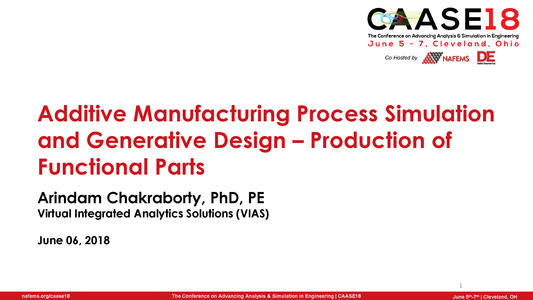 Additive manufacturing (AM) or 3D printing is maturing rapidly as a viable solution of make optimized parts for “real engineering” applications. What started as an amateurish persuasion has now evolved into a worldwide phenomenon that is touching industries from aerospace to industrial equipment to automotive to life science to energy & process, and others. The freedom of design that is achievable using AM process is un parallel in terms of reducing structural weight, reducing material cost, generating complex shapes and connections and introducing directional properties in a component. However, understanding of AM process and utilizing process parameters to optimize a design comes with many challenges. Currently, one of the emphasize is to use physics based realistic simulation to replicate the AM process numerically and relate process parameters to the concept of functional generative design that relates design with manufacturing process.