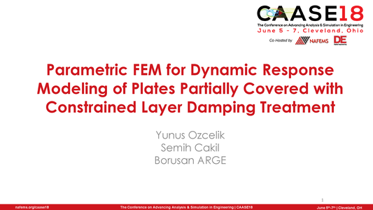 Plates are initially flat structural components bounded by two parallel faces. Because of several structural advantages, plates are used in bridges, airplanes, automobile, missiles, ships and machine parts. Surface damping treatment is used to solve resonant noise and vibration problems associated with plates. One of them is constrained layer damping treatment, where viscoelastic layer is sandwiched between base plate and a stiff constraining layer. Constrained damping treatment is widely used in automotive components such as dash panel, oil pan, rear wheel wells to reduce unwanted vibration and noise levels. Moreover, using constrained layer damping on the automobile components reduce complexity, weight and cost compared the traditional NVH treated components. Therefore, modeling of components covered with constrained layer damping is vital to optimize thicknesses of lower, middle and upper layers. In this study, dynamic response of plates partially covered with constrained layer damping treatment is studied using ANSYS Parametric Design Language (APDL). Geometry of base plates, viscoelastic and constraining layers, mesh density, material properties, boundary conditions are modeled parametrically using ANSYS APDL. Since mechanical properties of viscoelastic materials are affected by operating temperature, shift factor is calculated using Arrhenius Model to take operating temperature into account. Complex modulus and loss factor for each interested frequency is computed using Ross, Kerwin and Ungar (RKU) equations. In the light of above information, the program calculates desired natural frequencies and mode shapes. Moreover, frequency response function of plates are calculated for interested frequency range. Besides, the efficiency of constrained layer damping treatment is examined in detail by comparing dynamic response of both damped and undamped plates. In the second part of this study, parametric finite element model is verified using analytical formulations, where dynamic response of beam covered with constrained layer damping treatment is computed using continuous beam formulations. Both analytical and finite element methods are compared for a simple case. After verification of parametric finite element model, several case studies are conducted to determine optimum design for different boundary conditions by changing thickness and location of both viscoelastic layer and constraining layer. As a conclusion, dynamic analysis of plates covered with constrained layer damping treatment using parametric finite element method is time saving compared to traditional analysis techniques since different materials, boundary conditions, thickness of both viscoelastic and constraining layers are simulated by changing only relevant parameters in the script.