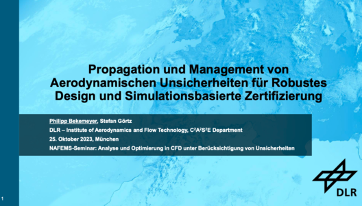 The presentation by DLR focuses on the critical role of uncertainty management in virtual certification and robust design, specifically in the context of aerodynamics. It begins with a motivation section, emphasising the handling of uncertainties as a crucial element for virtual certification and robust design, such as in laminar flow control, and questioning the reliability and adaptability of simulations in accounting for these uncertainties.