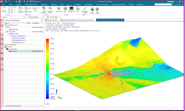 UTD is a ray-tracing based technique. The delay, the unit vectors of departure and arrival and the components of the electric field are available for each ray.Therefore, it is suitable for any kind of application which requires the evaluation of the frequency response and of the channel impulse response such as is the case of simulating wireless communications. Other parameters such as the Power Delay Profile, the Delay Spread, the Angle of Arrival (AOA) and the Angle of Departure (AoD) can be derived from the computed responses. The Spreading function can be derived for those applications requiring to account for the relative motion between the transmitting antenna and receiving antenna, applicable in Vehicle to Vehicle (V2V), Vehicle to Infrastructure (V2I) and Vehicle to Everything (V2X) communication. The following figure shows the typical analysis performed by a UTD solver, where a 5G antenna radiation is visualised over a large rural area.