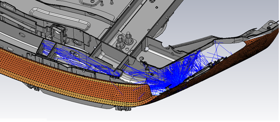Bumper Installed Automotive Radar Performance, Ghost Targets Analysis (Jaguar Land Rover), Asymptotic Shooting Bouncing Ray: Size of the problem is electrically very large and the length of the rays can give an insight into risk for ghost targets (blind spot monitoring).