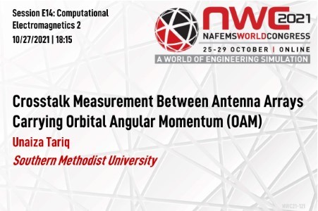 We describe a method to determine the crosstalk between two adjacent transmitter and receiver antennas using ANSYS High frequency simulation software (HFSS) and ANSYS circuit. The antennas used, emit waves carrying orbital angular momentum (OAM). However, the method can be generalized for other antennas. The OAM antenna consists of a circular array of eight rectangular patch antennas. The input signal is split into 8 to feed each of the patches. To generate an OAM wave, the signal to each patch is phase shifted by 45 degrees from the adjacent patch, increasing in the anti-clockwise direction for mode +1, and in the clockwise direction for mode -1. The experimental setup consists of adjacent transmitter and receiver OAM antennas. To determine the decrease in crosstalk due to OAM modes, crosstalk S12 is measured between the two antennas with receiver mode varied between -1 and +1, and transmitter mode fixed at +1. The difference in crosstalk is calculated to determine ΔS12, for varying distances. In HFSS, each patch is fed by a lumped port, and the excitation voltage is to be increased by 45 degrees across the array in a clockwise or anticlockwise direction. This is not possible in HFSS, in the case of the receiver, so ANSYS circuit is employed. The HFSS project consisting of two adjacent patch arrays is embedded in ANSYS circuit as a subcircuit model to create a dynamic link. An input signal is split into 8 using a 1 to 8 divider to provide excitation to the transmitter pins, via phase shifters. The phase shifts are sequentially incremented by 45 degrees. Similarly, receiver pins are connected to phase shifters and then combined using an 8 to 1 combiner which is connected to an output port. Therefore, the crosstalk between the transmitter and receiver ports can be determined in ANSYS circuit.