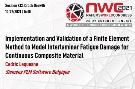 Composite materials have been used for many years in industries such as the wind power, automotive and aeronautics to design lightweight structures with high mechanical performances, i.e. stiffness and strength. However, the microstructural complexity of the composite materials challenges the estimation of the load carrying capabilities of composite structures. Failure in laminated composites is usually caused by inter-laminar fractures, such as delamination or adhesive joint debonding, promoted by or coexisting with intra-laminar damage mechanisms, like matrix cracking and fibre failure. This paper presents a method for modelling fatigue-driven delamination using finite elements and a cohesive zone model approach. The fatigue damage rate is linked to a Paris’ law-like expression for the crack growth rate evaluated using the energy release rate and constant load ratio. A J-integral formulation that defines an integration path across the length of the cohesive zone allows accurate computation of the energy release rate. Integration paths are tracked following the growth driving direction at each integration point, which is computed as the gradient of the ratio of the total performed work to the interfacial fracture toughness. Only the maximum loads of the fatigue cycles are simulated and a cycle jump algorithm is applied to avoid prohibitive CPU time together the adaptive cycle integration algorithm in order to account for static damage during the cycle jump. The jump criterion is based on a target crack growth increment chosen by the user. This method was implemented in the solver Simcenter Samcef. To validate the implementation, a batch of two double cantilever beam (DCB) specimens made of a non-crimp fabric laminate were tested applying a constant mode I bending moment on each arm. The specimens included a partial reinforcement at the mid-width to promote a curved delamination front during propagation. The experimental crack front shape evolution was well reproduced by the simulation method. The crack front propagation was slightly underestimated compared to the experimental results. However, the difference between experimental and simulation results at the end of the analysis is comparable to the variation in crack propagation among the different demonstrator specimens experimentally tested.