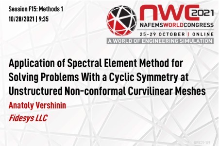 An approach for the numerical simulation of cyclic symmetry conditions on non-conformal curvilinear meshes using spectral element method is presented. The multi point constraints (MPC) method [1,2] is used to set the imposed displacement constraints and the Direct elimination method in matrix form is used to add them to the system of equations with mass and stiffness matrices. When forming MPC conditions on non-conformal meshes, it is proposed to rotate the surfaces on which the conditions of cyclic symmetry are set, and then search for the projection of the master-node onto the slave-surface by the method used in the search for contact pairs [4]. Further, the constraint equations are combined together for the original (not rotated) node and its projection. The conditions of equality of displacements and equality of normal stresses are imposed at cyclic surfaces. An algorithm for transforming constraints to identify the principal and dependent degrees of freedom is described. A direct elimination method is proposed to exclude the dependent degrees of freedom from the finite element system of linear equations. The influence of a symmetrization matrix additional to the stiffness matrix and containing the condition of equality of normal stresses is considered. Algorithm was implemented in CAE FIDESYS [5]. As an example of application of the developed algorithm, solutions of several problems with cyclic symmetry are considered. The proposed approach makes it possible to specify conditions of cyclic symmetry, which are fulfilled exactly, in contrast to penalty methods. And at the same time, the developed algorithm allows the use of non-conformal curvilinear grids, which simplifies a mesh generation process and provides high accuracy in the discretization of complex geometric CAD-models. The reported study was funded by Russian Science Foundation project - 19-77-10062. References: [1] Abel J and Shephard M 1979 An algorithm for multipoint constraints in finite element analysis Int. J. Numer. Meth. Engng 14 pp 464–467 [2] Felippa C 2004 Introduction to finite element methods. Chapter 8 Multifreedom constraints I. Colorado, Department of Aerospace Engineering Sciences and Center for Aerospace Structures University of Colorado Boulder pp 1-17 [3] Kukushkin A, Konovalov D, Vershinin A and Levin V Numerical simulation in CAE Fidesys of bonded contact problems on non-conformal meshes 2019 J. Phys.: Conf. Ser. 1158 032022 [4] Zienkiewicz O and Taylor R 2014 The Finite Element Method for Solid and Structural Mechanics Seventh Edition (Amsterdam: Elsevier) [5] www.cae-fidesys.com