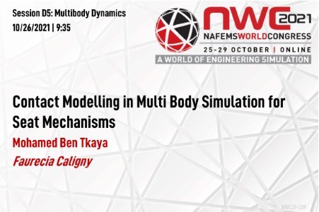 Seat mechanisms are the components which enable to adjust seat’s position. Functional simulation aims to reproduce the behaviour of these mechanisms during their normal usages whereas FEA simulations are used for strength prediction. Functional simulation needs a precise description of different components geometry and contact interactions definition between different bodies. The classical approaches by using FEA modelling need a discretization of the geometries. To have a precise representation of the components, the use of fine mesh becomes mandatory for better description of the contact surface. this will lead to a high CPU time and an accuracy issue. Chosen methodology for functional simulation in Faurecia Automotive Seating is multi-body dynamics using Simcenter- 3D Motion software. In this tool two types of contact can be used to define interaction between bodies: analytical contact and 3D contact. The first one is based on Hertzian theory and complicated geometries are approximated by several analytical contacts. Second type of contact is based on a discretization of the real surface by facets. Choice of contact in model can have impact on results. To industrialize the application of Simcenter 3D Motion modelling on different product, a fixed methodology must be defined, specifically, for contact modelling. This work describes the methodology used by Faurecia in multi-body and functional modelling. In the first section a description of different contacts used in Simcenter 3D Motion is presented with a comparison of results between used approaches and the sensitivity of results to different contact settings will be presented. The second section will describe Faurecia methodology and the impact of the contact choice on tracks simulation. The third section presents an application on gear by using different types of contact. A comparison between different approaches is realized. To conclude, some efficiency tools developed using NX Open to automate model preparation based on developed methodology are presented.