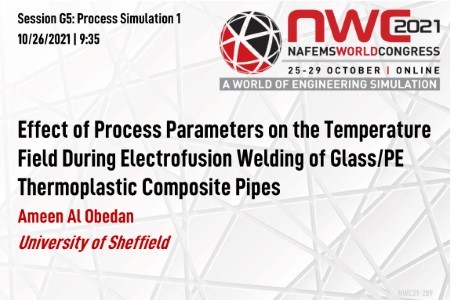 The replacement of metallic pipes used in the energy industry by corrosion-free, lighter and flexible, non-metallic pipes has increased dramatically over the past decades. Single layer thermoplastic pipes have been used extensively in low pressure water and gas applications whereas three-layer thermoplastic composite pipes (TCP) increasingly are being adopted in higher pressure applications, such as oil and gas flowlines and water injection lines. The majority of TCP are joined by metallic connectors, unlike single layer thermoplastic pipes which are usually joined by electrofusion welding. Extending the capability of electrofusion coupling to high pressure TCP offers the advantage of having a full non-metallic system (i.e., corrosion-free), improved sealing capacity and potentially a lower cost solution for some selected applications. However, joining TCP using electrofusion welding poses a number of challenges. Among the important considerations, special attention should be given to the behaviour of the reinforced composite laminate layer during the welding process, as excessive heat may disturb the material microstructure and hence the mechanical properties of the pipe. Finite element modelling is required to understand the effect of welding parameters on the thermal response of TCP during electrofusion welding. In this study, a 2D multiscale model representing the pipe/fitting assembly is developed using COMSOL Multiphysics software. The purpose of this model is to simulate the transient heat transfer during electrofusion welding of Glass-PE TCP with the aim of optimizing the welding parameters and coupler design to achieve the required long-term joint performance. Temperature dependent material properties, thermal surface resistivity, material phase change and thermal expansion are accounted for in the model. A special attention is given to the heat source model in order to better simulate the heat input into the pipe material during the welding process. A sensitivity analysis is carried out to determine the influence of various parameters on the heat transfer including the power input, heating wire size and depth, contact between the fitting and the pipe, and thickness of the external pipe layer. An experimental validation is conducted with a real pipe/fitting, and the temperature profile is recorded during the entire welding cycle utilizing an infrared camera and pre-installed thermocouples at different depths and locations in the pipe/fitting assembly. The results of the experiment are used to calibrate the key model parameters at different welding times.