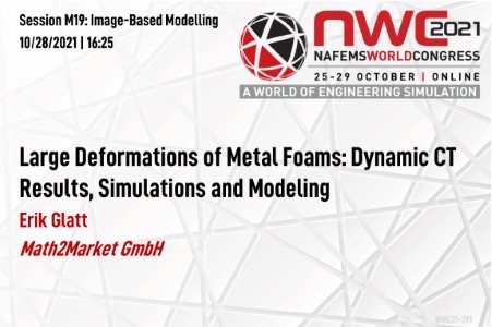 Metal foams are used in a wide range of applications, for example in energy dissipation and as lightweight materials. When metal foams are an integral part of a structure, the mechanical characteristics and their response to external load need to be well understood. To facilitate a greater understanding, we have utilized lab-based dynamic computed tomography (CT) provided by Tescan to visualize uninterrupted compression of aluminum metal foams. These results where coupled to mechanical simulations of the same samples done with GeoDict. The dynamic CT reveals the different modes of deformation like buckling or bending of struts and collapsing of cells. Moreover, the displacement and deformation of pores can be analyzed and quantified once the scan is imported into the software. The simulation of the compression of 35% is possible thanks to the voxel based FFT solver FeelMath in GeoDict developed by the Fraunhofer ITWM. By comparing simulation and scan, the simulation can be verified in two ways: first, the load curves show whether the stresses in the foam are similar in simulation and experiment. Second, the different deformation modes observed in the simulation can be compared to the deformation modes in the scan as well as the evolution of pore shapes with increasing compression. Two samples from the same foam are tested, analyzed, and simulated. In a next step the verified simulation setup could be used not only on a digital twin obtained by importing a CT scan but also on a statistical digital twin of a foam which can be digitally generated based on the geometrical analysis of the scan. The statistical digital twin can be created with the FoamGeo module in GeoDict. This opens the possibility to create digital foam structures with new properties and to predict their deformation. GeoDict can be used to perform digital parameter studies without the need of manufacturing the foam.