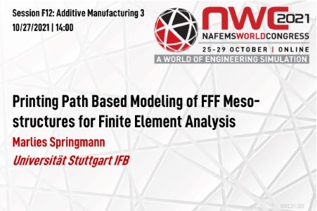 The Fused Filament Fabrication process (FFF) is a well-known and widely used additive manufacturing process to produce mainly prototypes and pilot series using thermoplastic materials. Continuous improvements in printer hardware and the development of suitable materials make its use in end-products conceivable. The additive manufacturing principle allows the production of geometrically complex components, e.g. topology-optimized components, which would be impossible using conventional manufacturing processes. Due to the layer-by-layer printing principle and manifold process parameters, FFF components usually exhibit a complex meso-structure and show strong anisotropy of the mechanical properties. The meso-structure is created by path-based extrusion of the filaments and thus determines the mechanical behavior of the structure. The relationships between meso-structure and mechanical behavior cannot be captured by common design methods. Due to the lack of structural mechanical analysis capabilities, the use of FFF components in end-use applications requires component-specific experimental validation. In this work, an approach for realistic modeling of the meso-structure of FFF components for a finite element analysis (FEA) is developed. The model is based on the actual printing path. Using a Python script, the relevant coordinates can be extracted from the machine code and movements without material extrusion can be removed. Based on the extracted coordinates, a wireframe model of the printing path is generated in a CAD environment. The geometry of the individual filaments as solids is created by sweeping an elliptical filament cross-section along the wireframe model. Subsequently, the generated meso-structure is partitioned and meshed using the FEM software ABAQUS. A study is performed with the aim of investigating the required number of elements, their size and the expected computational effort. The method is validated with tensile experiments. For this purpose, flat tensile specimens with 100% infill and a 0°/90° oriented infill are fabricated and tested. Using the printing path based modeling method, the tensile tests are modeled and simulated in ABAQUS.