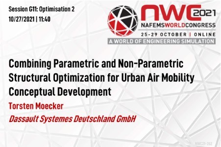 With multiple startups and Original Equipment Manufacturers (OEMs) competing to develop conceptual vehicles for Urban Air Mobility (UAM), new tools and methods are necessary to streamline the design process to meet the ambitious goals of this emerging industry. Determining appropriate lightweight configurations for the airframe structure is a challenging task, as it requires close collaboration between different disciplines, such as design, structural optimization and flight mechanics. The focus of this paper is on proposing an efficient workflow for conceptual structural sizing, which benefits from the tight integration of parametric design, simulation and optimization capabilities. To obtain the optimized lightweight design, parametric and non-parametric optimization techniques are combined. The workflow is entirely based on parametric design data, generated through a combination of graphical visual scripting and interactive 3D modeling. This method enables the engineer to create logic to parametrically build all required components of the internal structure, including ribs, spars, frames, and stringers. Fully associated with this parametric design model, a structural model of the UAM vehicle is built, allowing for design space exploration. In any given flight condition, the vehicle is subjected to aerodynamic loads, rotor forces, gravity and inertia loads. Aerodynamic loads are determined using a Computational Fluid Dynamics model, which is again fully associated with design, while rotor forces are computed to ensure flight loads equilibrium. Considering two exemplary load cases representing critical flight conditions, parametric and non-parametric structural optimization techniques are then combined, aiming at minimal weight for a targeted stress level. Based on results from a parametric design study, an optimized configuration of the parametric UAM vehicle is determined. In addition, non-parametric sizing techniques are applied, allowing for further reduction of mass by optimizing the distribution of skin thicknesses and stiffener properties. In a final step, structural requirement checks for buckling and strength are performed to validate the optimized configuration.