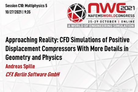 The numerical simulation of positive displacement compressors (or expanders), like screw or scroll compressors, is more complex compared to dynamic pumps, turbines or fans. The gas transport in size-changing chambers with very small clearances between the rotors, and between rotors and casing, demands complex meshes that change with each time step. Furthermore, the physical effects are complex, too: high-speed leakage flows occur, heat is generated by compression and friction and heats up rotors and casing, causing thermal deformation that changes clearance sizes, and often liquid phases due to oil injection (as lubricant, coolant and sealant) or condensation (in steam expanders or refrigerant compressors) are important. Most CFD simulations so far focus on gas transport and compression in non-deforming geometries only. We present simulation strategy and results with the commercial programs TwinMesh (for mesh generation and pre-processing) and ANSYS CFD (for CFD and CHT simulations) that allow the accurate prediction of compressor performance on fine structured meshes including multi-phases, CHT, and thermal and structural deformations in reasonable times. The results allow the time-resolved calculation of global quantities like forces, torque, power consumption, and local quantities like pressure, velocity, temperature, phase distribution, or heat fluxes. Losses due to throttling effects or leakages can be detected and minimized, effects of changes in rotor profile, inlet and outlet ports, or injection strategies can be visualized and compared. Furthermore, the interaction of surrounding system components like pipes, valves, vessels with the compressor can be examined through co-simulations with the 1D CFD solver Flownex. The presentation gives an overview on pre-processing and solution steps and shows examples for several compressor simulations: For a two-sided screw compressor, pressure and thermal loads on the rotors are computed from CFD and used for deformation calculation; a two-stage compressor in a full vapour-compression refrigeration cycle with R22 in gaseous and liquid state is shown; and a 3D screw compressor is simulated in a 1D CFD network of a pressurized air supply station to describe storage vessel loading.