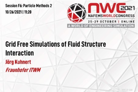 Since 1999, Fraunhofer ITWM develops the so called Generalized Finite Difference Method (GFDM), a purely gridless simulation idea for flows and continuum mechanics. The method bases on moving pointclouds. The points represent numerical nodes, where the differential equations of motion are discretely solved. The points carry no mass, but are purely numerical nodes. As it moves with the flow, the pointcloud’s quality has to be maintained throughout the simulation (point filling, point removal), taking into account local refinement strategies. The moving pointcloud makes it a preferred tool to model free surface flows, FSI, moving geometries. Any partial differential equation can be solved. The central requirement for this is a reliable approximation of spatial derivatives of the discrete functions. The local approximation stencils are established by a local least squares procedure, which allow for desired orders of approximation. This approach represents a generalization of classical Finite Differences. The method is employed in different industrial applications, among them water crossing, rain water management, filling and sloshing, airbag inflation, freezing. In this presentation, we will focus on free surface flow modelling in conjunction with fluid structure interaction (FSI). Usually, FSI is put into praxis by an explicit coupling of a CFD and a structural code. In our particular example, the CFD-method is GFDM, that is coupled to some structural codes, being on the market, or to our own multibody solver (MBS) implementation. Usually, explicit coupling suffers from inherent numerical instabilities, and we show approaches how to neutralize them. As example for the coupling to a structural code, we will show the roll-over simulation of a vehicle in a sand bed, and the interaction of a vehicle with water during water-crossing. The crossing of heavy trucks over a floating bridge will be a demonstration of the coupling of GFDM to our own MBS.