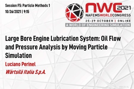 Lubrication is a crucial aspect when talking about efficiency and durability of any moving machine parts and, in particular, for large internal combustion engines. As per definition a lubrication system is designed to deliver a reasonably stable and clean oil film at the correct temperature and with the proper flow. It must accomplish several purposes like prevent direct contact between moving parts, reduce friction, reduce wear, provide cooling, sealing and cleaning effect, adsorb shocks and reduce noise. All these functions together, contribute to components and systems lifetime and ultimately to the overall engine operation. Predicting and simulating engine lubrication performances is therefore particularly challenging both in terms of oil splash in the sump and in terms of forced flow in the oil circulation system. Referring to the latter, a CFD model of the oil channels needs to take into account the inertial effect due to the complex motion of the engine parts, and it has to be able to simulate the transient nature of the flow with far different spatial scales at the same time. In large combustion engine having some meter-long crankshaft, the flow inside bearings and the leakage through small gaps strongly affect the oil flow and pressure behaviour. In this study the attention was focused on the big-end-bearings oil feeding system of an 18-cylinders engine configuration, which is one of the biggest existing gas 4-stroke engine ideal for base load application. Wärtsilä and EnginSoft built a Moving Particle Simulation model, a mesh-less method to solve the Navier-Stokes equations, which allows simulating very complex geometries with moving parts. The Wärtsilä engine model included all the relevant moving items, like crankshaft, bearings, connecting rod and pistons with their motion. The modelling and simulation of the engine using Finite Volume CFD techniques would be unfeasible due to the geometrical complexity of the oil system and above all due to the motion of the engine parts, which would make the management of the mesh motion not practicable. By simulating the flow through the channels, the Moving Particle Simulation model allowed calculating the transient pressure behaviour in crucial areas. The comparison of two bearing configurations highlighted differences in terms of pressure stability, peaks and low values that could potentially lead to cavitation issues. The results of the comparative analysis are presented and explained, together with accompanying illustrations.