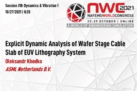 To produce microchips modern optical lithography systems are used. In an attempt to follow Moore’s law ASML is using extreme ultraviolet (EUV) light in their machines, which has a wavelength of only 13.5 nanometers. In EUV systems the wafer is rapidly moving inside a vacuum chamber where a blueprint of the chip is projected onto a silicon wafer with nanometer accuracy. To ensure that the wafer is at the right position at the right time, a position module is used. It’s connected to the base frame of the machine by means of a flexible connection called cable slab, which consists of cables for power and data, and hoses for transport of fluids and gasses. Because of high accelerations of the position module the cable slab behaves very dynamically. As a result, large deformations occur which might cause the cable slab to hit other parts inside the machine. Insufficient clamping force may also lead to slip between cables and brackets. This could result in damage or wear of the cable slab. Additionally, due to this dynamical behavior disturbance forces occur on the position module which negatively influence the positioning of the wafer. This article focuses on the prediction of the dynamic behavior of wafer stage cable slab in order to overcome existing issues and potentially minimize disturbance forces acting on the position module. To simulate complex non-linear dynamic behavior of cable slab at high operational speeds Altair RADIOSS explicit solver was used. For the propose of correct representation of cable slab’s behavior during different dynamic load cases, pre-loading of a system was performed by application of folding motion and gravity acceleration. Dynamic effects in these quasi-static load cases were minimized by using slow dynamic computation and energy discrete relaxation approaches to converge simulation towards static equilibrium. Following pre-loading steps, dynamic analysis of cable slab under various operating conditions was conducted. Proposed model allows fully describe the stress-stain state of cable slab at any given time and track its volume consumption during simultaneous movement of position module in two perpendicular directions, thus predict potential volume conflicts with surrounding parts. Knowledge about magnitude of contact forces at the interfaces allows to predict a wear of contacting parts. Disturbance forces on position module due to dynamic motion of cable slab also were investigated. Simulation shows a good level of correlation with experimental results obtained on test rig.