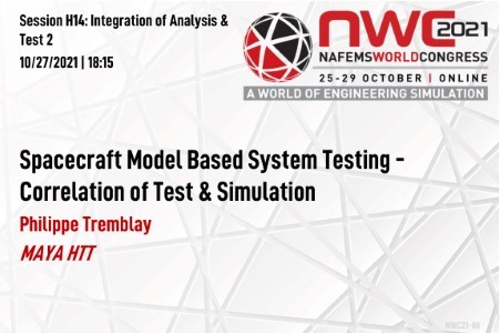In 2019, three Canadian satellites, developed by the Canadian Space Agency, were successfully launched into orbit. Using the example of Radarsat Constellation Mission (RCM) satellite, we will present the benefits of a seamless collaboration of simulation & test for complex space systems. How does the FE model of a RCM spacecraft represent reality? One way to find out is to perform modal testing and to compare, or correlate the Test and Simulation Results. This is particularly important in the space industry, as launch loads are derived from validated models of the launch vehicles and the spacecraft. A poor model means uncertain loads which increases program risk. This paper presents how modal simulation is used to prepare the test. Indeed, how can we apply simulation for more productive and realistic testing? Before the RCM modal test is performed, requirements must be defined, as sensors such that the required modes can be clearly identified. How many sensors & exciters are required, where are they located and in which directions do they point? Also, in order to visualize test mode shapes, the test engineers requires a wireframe mesh that connects the sensor and exciter nodes. Finally, test article configuration and boundary conditions have to be investigated. During the modal test campaign, simulation and test results did not correlate properly. Based on quantitative and qualitative tools (MAC, MODMAC and Orthogonality), test and simulation FRFs and mode shapes have been compared. Once correlation establishes the differences between both representations, the FE model has to be updated to more accurately represent reality. Based on an optimizer, which can handle large amounts of variables (physical and material properties); the finite element model has been updated. It was complicated by the test boundary conditions in which the spacecraft was bolted to a concrete floor. This paper presents attempts to account for the flexibility of the interface plate and for the effect of the floor and of the underlying soil in the updating process. This paper unpacks all the challenge of the modal simulation-test interaction. In addition, it presents a fully integrated workflow to reduce iteration-engineering loops, improve simulation-test interaction recently developed to simulate space system. Multi-discipline analyses have been performed on the updated FE model to validate the design against specific loading conditions (acoustic, vibro-acoustic, dynamics…).