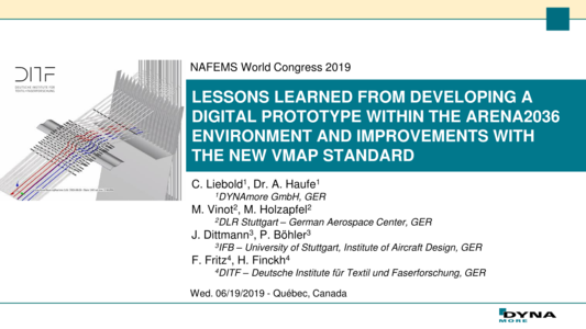 In 2013, a new research campus called ARENA2036, which is the abbreviation for Active Research Environment for the Next Generation of Automobiles, has been established at the University of Stuttgart. The year 2036 accounts for the 150th anniversary of the patented version of Carl Benz’s first three-wheeled vehicle with a combustion engine which led to the first serial production of motorized vehicles as we know them today. The main focus of the research campus is to investigate the rising importance of Industry 4.0 applications and in a first phase, three leading technical projects worked on topics such as lightweight design and system/sensor integration (LeiFu), new and adaptive production lines in industrial environments (ForschFab), and enhancing simulation capabilities with the definition of a digital prototype (DigitPro). The latter aimed to improve the daily life of simulation engineers by developing a digital prototype which defines a simulation data exchange platform based on a HDF5 data storage container and by improving mapping schemes to structural analysis meshes for selected process simulations such as braiding, resin infiltration, open-reed weaving (ORW), and draping of continuous fiber reinforced plastic (CFRP) materials. This should help to close the simulation process chain within the project and is now used as a basis for a subsequent 5-years governmental funded project called “Digital Fingerprint".