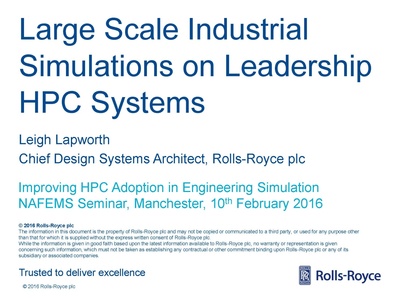 Presentation made by L. Lapworth at the NAFEMS UK Seminar "Improving High Performance Computing (HPC) Adoption in Engineering Simulation" that was held in Manchester, UK on the 10th of February 2016.