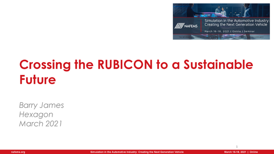 This presentation will talk about RUBICON, a project where Hexagon is studying radical options for future urban mobility. Naturally, EVs are considered, but making transport sustainable is not just about changing the energy source. As vehicles become connected and autonomous, a scenario is investigated where Mobility as a Service (MaaS) is provided by an urban taxi fleet. Cost and CO2 per passenger mile are introduced as key optimization targets, not just for vehicle operation but also accounting for manufacturing, averaged across the lifetime of the vehicle. By operating the autonomous taxi at high levels of utilization, vast mileages accumulate, and the project proposes the design of an ultra-durable powertrain, targeting circa 1m miles of operation. The life cycle costs per mile are thus massively reduced. Further, the design of an innovative, Hexagon-patented permanent magnet electric motor that avoids rare earth metals is presented and is shown to perform far better than conventional solutions on other sustainability measures such as ozone depletion and ionizing radiation. Thus, we see Hexagon committing heavily to sustainability, not only as a supplier of software packages, but as a leader on the sustainability agenda, driving change and being fully cognizant of the challenges and opportunities of next generation vehicles.
