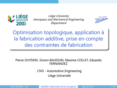 Optimisation topologique, application à la fabrication additive, retours sur projets divers, prise en compte des contraintes de fabrication