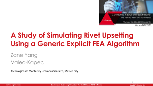 Although upsetting the rivet has been used for very long time in production lines, Numerically simulating its behavior has not been brought about until recently because of many challenges involved. One of challenges is that the rivet material is severely undergoing large plastic deformation as the tail of rivet quickly flows to be shaped into a rivet head.