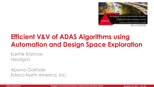 Simulation helps remove a substantial hurdle in achieving a rigor in the testing to make the ADAS algorithms safe and reliable. Having said that, the sheer number of driving scenarios, driving conditions and systems to be tested make it a mathematically impossible task to achieve. This introduces the need to use mathematical design exploration techniques and machine learning techniques to run simulations on identified worst case scenarios and help sweep through relevant driving situations in an efficient yet effective manner. Further to replicate real world uncertainties in the driving incidents, stochastic analysis of simulations become important to test the robustness of the ADAS algorithms.