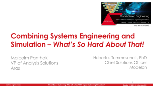 This presentation was made at the NAFEMS Americas Seminar "Model-Based Engineering: What is it & How Will It Impact Engineering Simulation" held on the 1st of October 2019 in Columbus Ohio