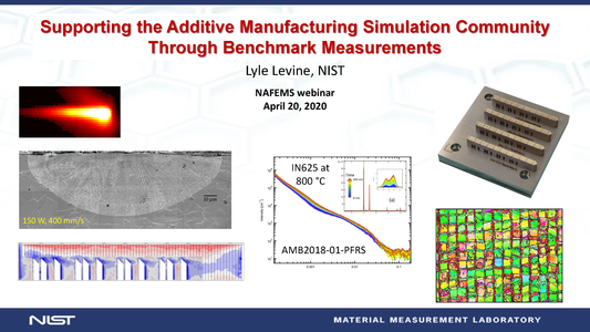 Additive manufacturing (AM) is a transformative technology that provides game-changing new capabilities across a wide range of material systems and applications. Polymer AM enables “mass-customization” by producing components or parts directly from 3D files. Metal AM enables production of three-dimensional parts with geometries that can be too costly, difficult, or in some cases, impossible to produce using traditional manufacturing processes. In many cases, however, difficulties persist regarding throughput, reliability, and the properties of the printed parts. Quantitative modeling is critical for predicting and understanding these issues, but model validation and verification requires community access to extensive benchmark test data. I will describe our establishment of the Additive Manufacturing Benchmark Test Series (AM-Bench) which provides rigorous measurement test data for validating AM simulations for a broad range of AM technologies and material systems. AM-Bench includes extensive in situ and ex situ measurements, simulation challenges for the AM modeling community, and a corresponding conference series. In 2018, the first round of AM-Bench measurements and the first AM-Bench conference were completed, focusing primarily upon laser powder bed fusion (LPBF) processing of metals, and both LPBF and material extrusion processing of polymers. In all, 46 blind modeling simulations were submitted by the international AM community for comparison with the in situ and ex situ measurements. Analysis of these submissions provides valuable insight into existing AM modeling capabilities. AM-Bench operates on a three-year cycle and all benchmark data are permanently archived and freely accessible online.