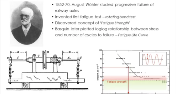 In many cases fatigue failures occur suddenly with little prior warning and so it is important to design structures to resist fatigue failure.In this short presentation we consider how material fatigue properties used in FE simulation are determined from laboratory tests. Starting with the very first ‘rotating-bend’ test invented by August Wöhler in 1852, we introduce the popular ‘load-control’ and ‘strain-control’ test procedures used today. Particular consideration is paid to the effect of ‘characterising the material’ to derive properties for the ‘design curve’. The design curve accounts for statistical scatter in the test results and is derived for a particular reliability target and confidence interval.