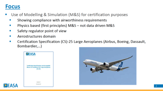 First, a brief introduction to the European Union Aviation Safety Agency (EASA) will be given. The main part of the presentation will address several aspects and examples related to modelling & simulation activities in the aerostructures domain that are performed to support the showing of compliance to airworthiness requirements. Topics such as test versus analysis, verification, validation, and errors & uncertainties will be discussed, all of which are related to achieving the necessary level of credibility when performing simulations.
