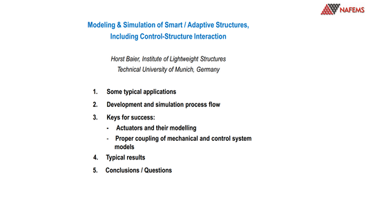 Investigations and use of smart or adaptive structures with integrated sensors, actuators and control loops to enhance performance has gained increased attention in recent years. The same holds for these and in other contexts often required consideration of dynamic effects in control-structure interaction. Examples for such smart structures are active vibration damping techniques, high precision shape control and also shape morphing structures which adapt to their environment and loads in order to enhance system efficiency. The related simulation and design requires the integration of actuators, smart materials and sensors into the structural simulation models. In case of shape morphing, geometric nonlinearities might have to be taken into account as well. After some further processing and possibly also model order reduction steps, such integrated models then are also to be coupled to dynamic control simulation tools. Integrated simulations then allow to determine proper material and structural parameters, proper positioning of actuators and sensors, and also essential parameters of the control loops to keep the system stable and enhance its operational efficiency.